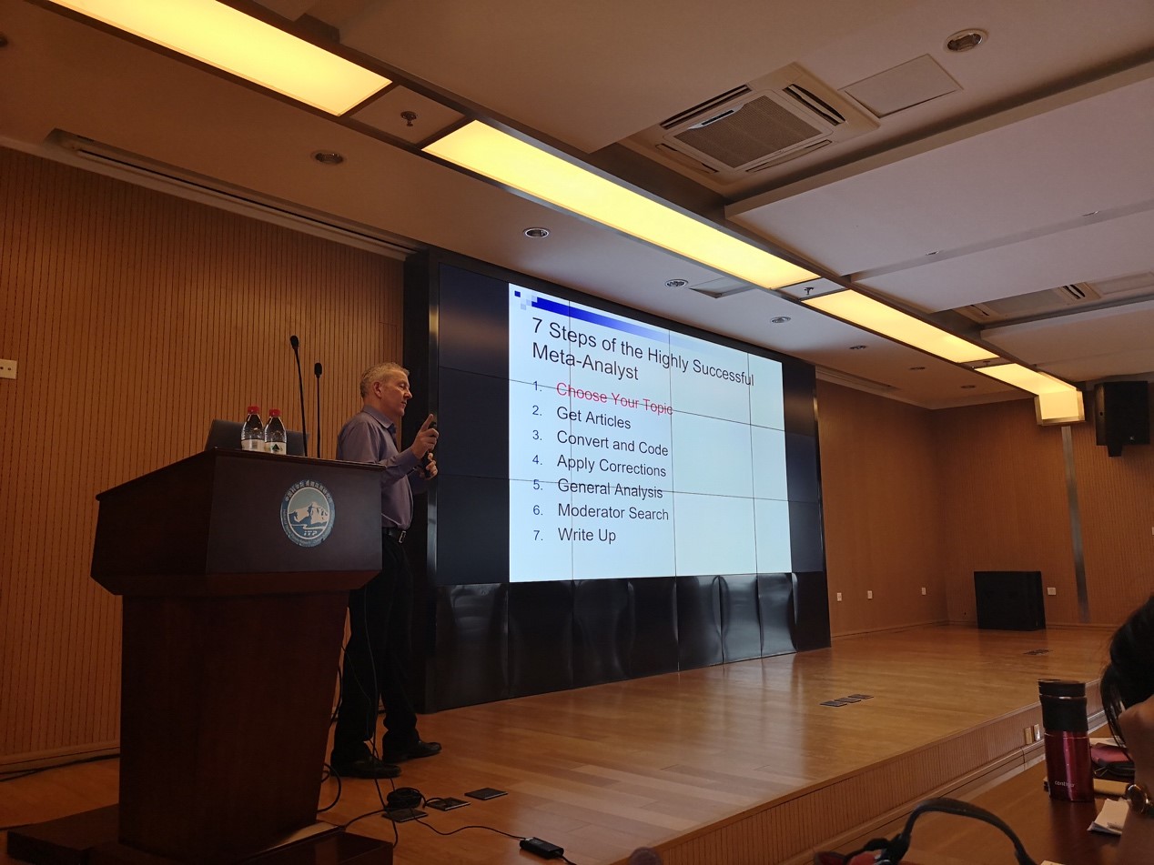 2日下午和3日上午,Piers Steel教授详细讲解并演示了元分析的七个基本步骤,并分享了基于元分析的 Metabus 工具的基本理念、使用方法和未来愿景。3日下午,两位教授针对参与者们之前提交的元分析研究计划进行了分组讨论,并对每个研究计划给予了相应的指导和建议。