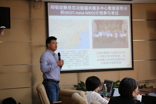 接下来,严超赣研究员汇报了REST-meta-MDD建立一年来项目进展和取得的成果。他从小样本研究的局限性谈起,结合国外ENIGMA项目的经验,论证了精神疾病脑成像数据大样本的必要性和可行性。REST-meta-MDD已经荟萃了来自17家医院和科研单位的25个研究组的1300例MDD与1128例正常对照数据,为现今世界最大的MDD脑功能成像数据库。严超赣研究组对于第一阶段的数据进行了初步分析,全体数据贡献人员做为共同作者的研究论文已提交审稿中。严超赣对接下来的数据分析提出了几条研究思路,希望各数据贡献单位利用大数据进行感兴趣的研究,并为此提供技术支持。