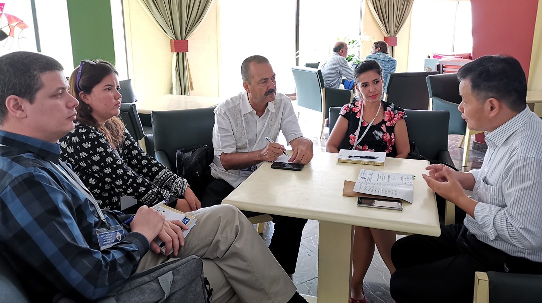 韩布新与古巴心理学会理事长Alexis Lorenzo Ruiz教授、外事主管Claudia博士等座谈