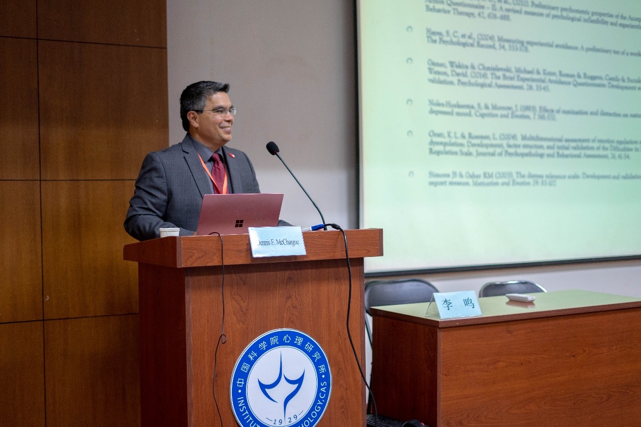 Dennis McChargue则结合自己的研究项目开展了题为“循证取向的物质滥用治疗中的临床心理学训练(Clinical psychology training in evidence-based substance use treatment)”的主题报告。他提出,在物质滥用的治疗研究中,精确选取适合入组的病人,在一些关键的时间节点收集数据,全面、完整地采集结果变量等都是非常重要的要素。同时,他也结合一些研究结果,介绍了一些在物质滥用的治疗中被证明有效的实践技巧。以上三场报告均由李鸣主持并翻译。