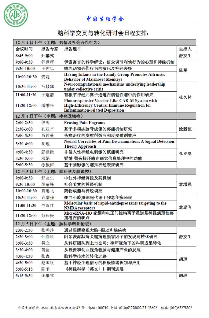 研讨会共设四个主题专场,分别是“共情及社会合作行为”“疼痛及镇痛”“脑科学及脑调控”和“脑科学转化论坛”。共有来自北京大学、中国科学院科学与智能技术卓越创新中心、复旦大学和永乐汇等高校及科研机构的二十多位专家带来了精彩纷呈的学术报告。此外,“脑科学转化论坛”还特别邀请了北京安杰律师事务所、中天汇富产业投资集团、清华大学出版社期刊中心的专家从法律、投资、创业和科学出版等视角探讨了脑科学与健康产业的发展与转化。