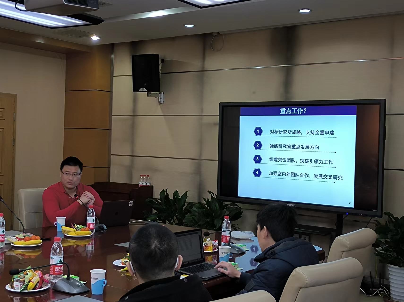 会上,各位PI介绍了各研究组过去一年完成的工作,以及新的一年研究规划,围绕研究室发展战略进行全面的交流讨论,并提出宝贵建议。会议提出了2023年研究室的重点工作,包括:对标研究所战略,支持全重申建;凝练研究室重点发展方向;组建突击团队,突破引领力工作;加强室内外团队合作,发展交叉研究。会议从多个方面展开深入讨论,氛围轻松愉快,同时也统一了思想、凝聚了共识、明确了方向。