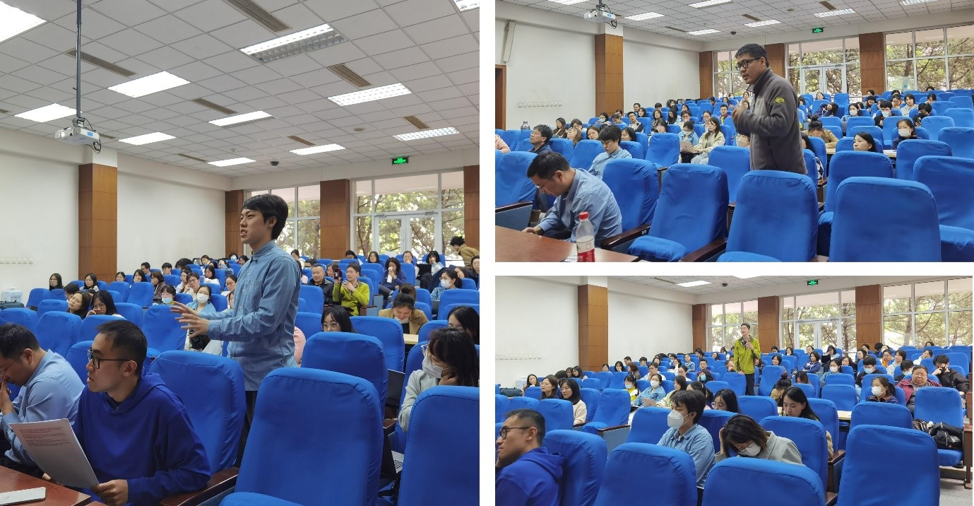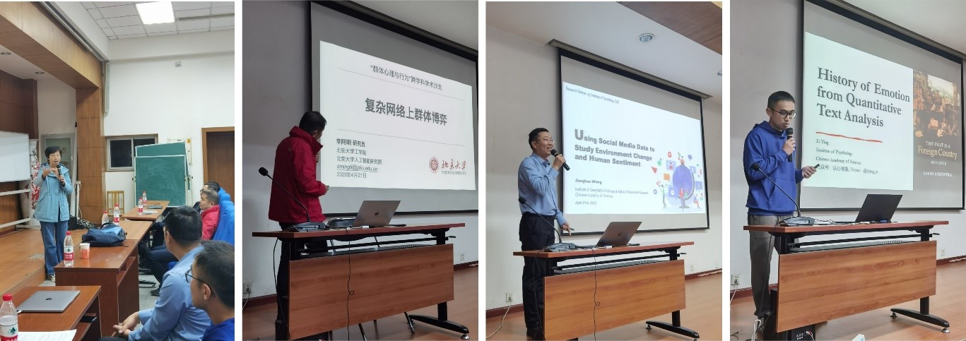 随后,李阿明、王江浩和李赢先后作了题为《复杂网络上群体博弈》、《社交媒体大数据驱动的环境变化与人类情感研究》和《从文本中追溯情绪的历史变迁趋势》的学术报告。李阿明介绍了近年来复杂网络上群体博弈理论研究取得的重要进展,以及相关的人类行为实验结果,并探讨了未来潜在研究方向。王江浩介绍了如何基于全球数十亿社交媒体地理信息和先进的自然语言分析方法,揭示人类群体行为和情感对环境变化的响应,并以气候变化、空气污染和重大传染病为例介绍了环境变化对人类行为与情感的影响与适应规律的最新研究。李赢介绍了如何基于自然语言分析方法,从大型历史文本中提取公众的心理特征,并以情绪、偏见和风险认知为例研究心理现象的历史进程。与会师生与报告人进行了充分的交流与讨论。