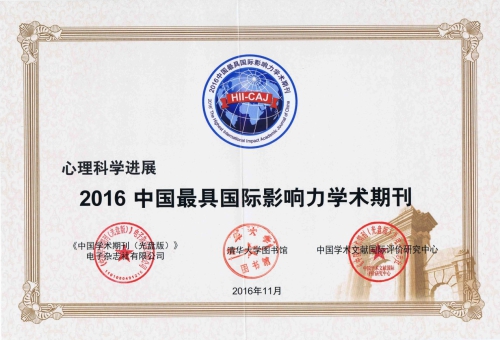 《心理科学进展》获“2016中国最具国际影响力学术期刊”证书
