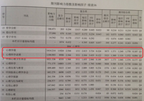 《中国学术期刊影响因子年报(2016)》依据影响力指数(CI)将每个学科的期刊分为Q1、Q2、Q3和Q4共4个区。心理学类的Q1期刊一共有2本,分别是《心理学报》和《心理科学进展》。