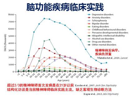 神经精神疾病给世界各国带来了巨大的社会与经济负担,这些脑功能疾病会发生在个体一生发展中的不同年龄阶段(图1),具有不同的心理和行为异常特征,研究与它们有关的脑连接随着年龄(随龄)发展变化的规律与机制,是对各类神经精神疾病进行早期诊断、病程监测和解读发病机制的关键。神经功能成像因其无损和非侵入性特点而被广泛用来研究各类重大脑疾病,以其为核心技术的人脑连接组学成为研究脑功能随龄发展机制的重要方法。