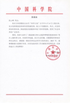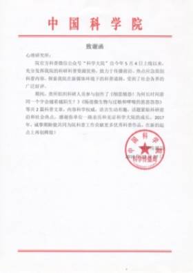 近日,心理所收到中国科学院科学传播局发来的致谢函,感谢心理所组织科研人员参与创作科普文章并向院官方微信公众号“科学大院”(ID:kexuedayuan)投稿。