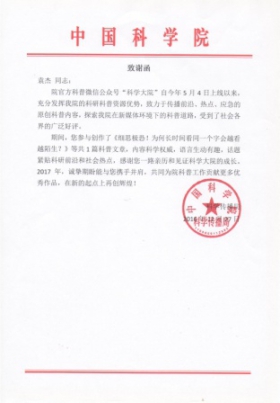 院科学传播局向心理所及博士后袁杰、段云峰发来致谢函