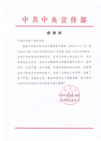 1月19日,心理所收到中宣部舆情信息局发来的感谢函,感谢心理所积极支持2016年度全国社会心态调查工作。基于该调查形成的综合分析报告受到中央领导同志高度肯定。
