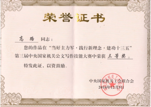 心理所高路的公文作品荣获第三届中央国家机关公文写作技能大赛三等奖