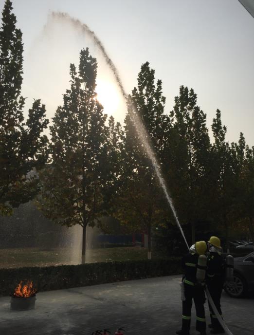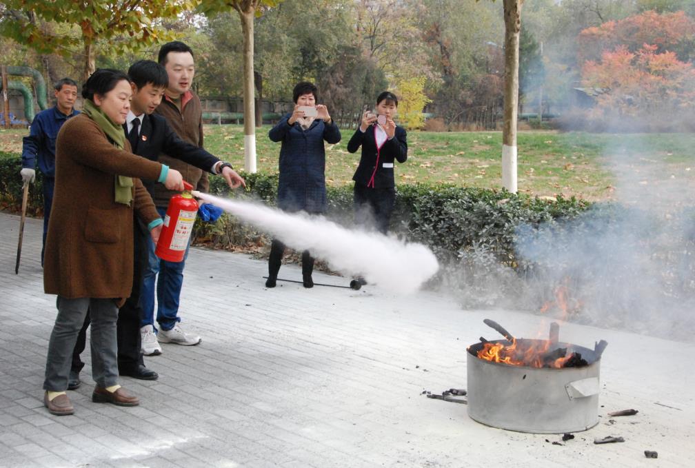 随后,资产处组织物业人员进行了消防器材演练,介绍所内配备消防器材的使用并连接消火栓对草坪进行喷淋演示,到场人员也手持各种灭火器进行灭火演练实践。器材演练结束后,物业项目部经理对物业人员进行了消防安全知识培训。