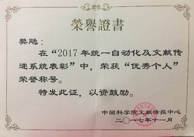 樊飏荣获院统一自动化与文献传递服务工作“优秀个人”荣誉称号