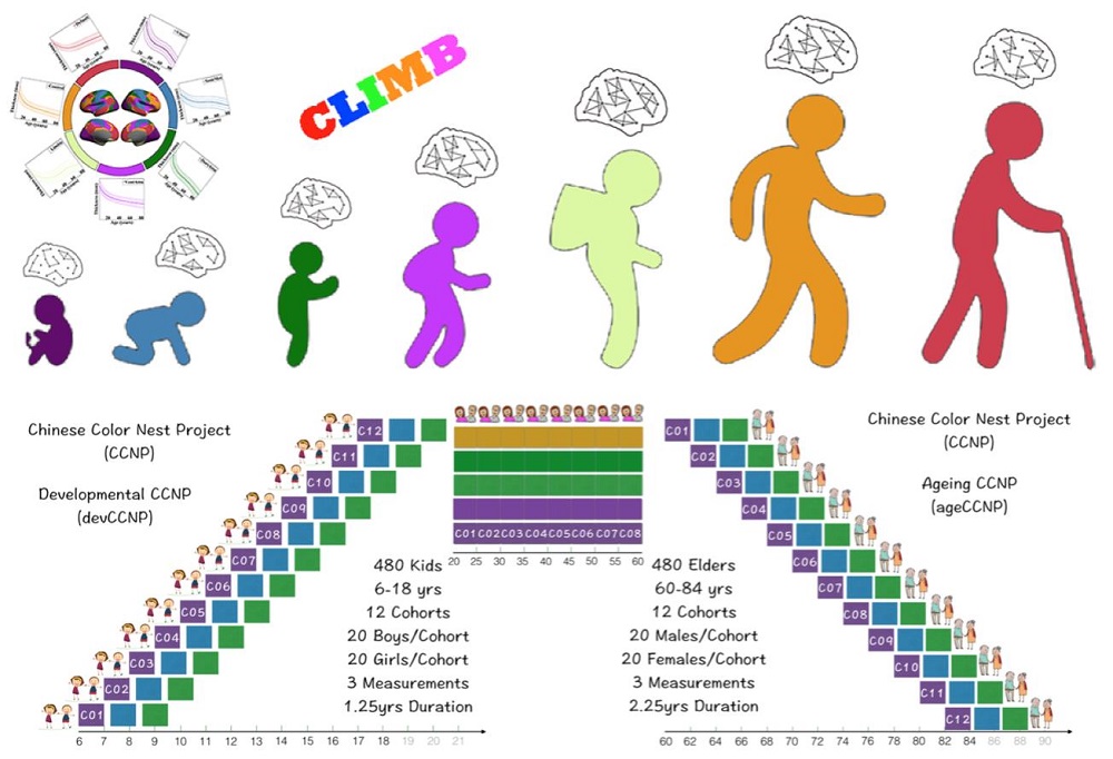 CLIMB以心理所“一三五”规划中的重点培育方向“心理行为的个体差异及其毕生发展规律与应用”为核心方向,旨在理解人脑结构功能、监测大脑发展进程、识别大脑发展异常、服务教育政策制定、预警大脑发展疾病、跟踪临床干预疗效,为未来国家脑计划中的相关研究提供毕生发展研究的测量工具、大数据信息化平台、方法学、数理模型、常模和转化应用等方面的关键支撑。近五年来,中心在中国科学院、国家自然科学基金委员会、中华人民共和国科学技术部和北京市科学技术委员会的资助下,已经在上述的研究领域取得了初步的成果:在计算方法学上,就人脑功能连接组一致性及稳定性和神经生物学意义展开系列研究[1],推动了国内外脑发育和临床脑功能疾病研究;领衔建立了国际信度与可重复性联盟CoRR[2],推动了国际神经影像学领域,特别是脑发育和脑疾病领域,对重测信度与可重复性及其大数据共享的重视[3];建立了国内首个学龄儿童脑智发育五年队列“彩巢计划-成长在中国”[4],绘制了人脑功能网络的形态发育曲线,揭示了额顶网络顶叶记忆模块的随龄发展规律,建立了其网络调控与行为之间的关联,发现了解剖距离是脑连接组随龄变化的关键驱动因素,据此提出人脑连接组随龄发展的数学生成模型[5];在队列建设过程中,主办了三次国际人脑发育会议,推出了三期脑发育影像学有关的学术专刊,应邀撰写多篇领域综述文章[3,5,6],促进了国内脑发育研究力量壮大,提出了“发展群体神经科学”新方向[7,8]。