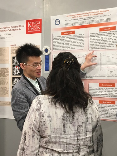 陈楚侨研究员还带领来自认知神经科学实验室、香港中文大学与上海精神卫生中心等单位的其他成员与学生在会上做了一系列研究展示,包括由陈楚侨研究员代硕士研究生周晗昱所展示的青年双生子群体的社会不信任研究,王毅副研究员报告的分裂型特质人群的面孔识别研究,上海精神卫生中心硕士研究生储敏怡报告的住院精神分裂症患者的快感缺乏研究。