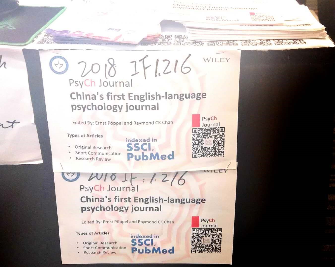 今年影响因子发布时,正值第29届国际应用心理学大会在蒙特利尔举行,PsyCh Journal编辑部第一时间在会上进行了宣传,获得众多关注。在应用心理学大会期间,来自心理所的前后三任联合主编张侃研究员、张建新研究员、陈楚侨研究员也都来到宣传场地,并与威立出版社的同事进行了深入交流,对PsyCh Journal良好的发展态势进行总结与展望。