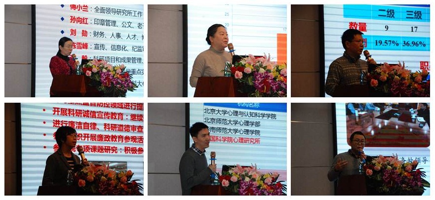 心理所副所长刘勋以《引育俊才强队伍 开源节流所兴旺》为题,对人事、财务、继续教育方面的工作进行总结和部署。心理所党委副书记、纪委书记、副所长陈雪峰对其分管的纪监审、宣传、信息化、等工作进行总结,并阐述了2019年的工作思路。