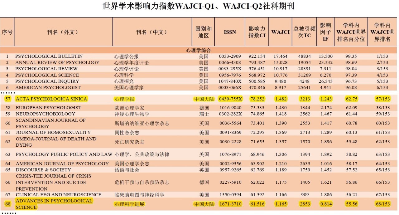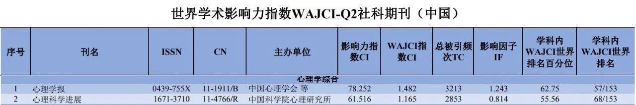 《心理学报》和《心理科学进展》入选WAJCI-Q2期刊,在“心理学综合”类全球153个评价源期刊中,分别位列第57位和第68位,为中国大陆心理学类期刊中仅有的两本进入WAJCI-Q1/Q2列表的学术期刊。