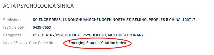 近日,《心理学报》(Acta Psychologica Sinica)已通过科睿唯安 (Clarivate Analytics)内容甄选的评估流程,正式被Web of Science中的ESCI (Emerging Sources Citations Index)数据库收录,成为中国大陆第一个被ESCI收录的中文心理学期刊。