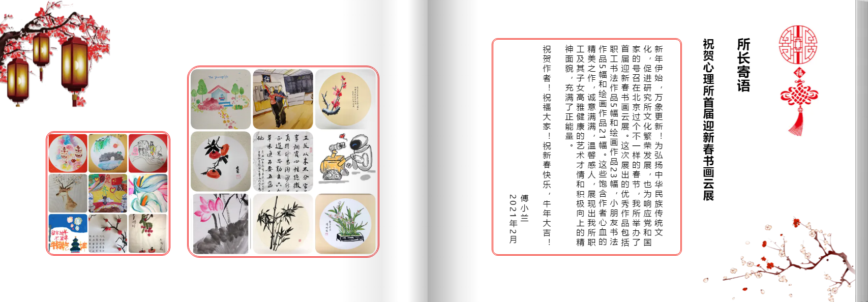 参展作品主题多样、内容丰富,传达了作者们热爱生活、积极向上的精神和高雅的艺术情操。参展作品集结成册,心理所所长傅小兰撰写贺词,于元宵节正式发布,受到全所职工的广泛好评,记录了2021年春节的美好回忆。