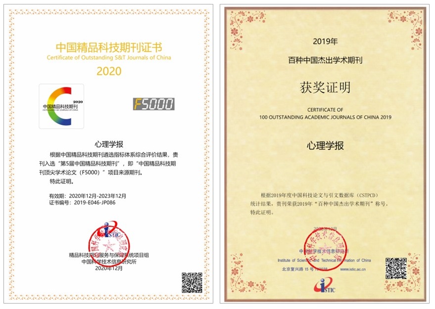 日前,中国科学技术信息研究所发布2020年中国科技论文统计结果。《心理学报》入选“第5届中国精品科技期刊”和“中国百种杰出学术期刊”。