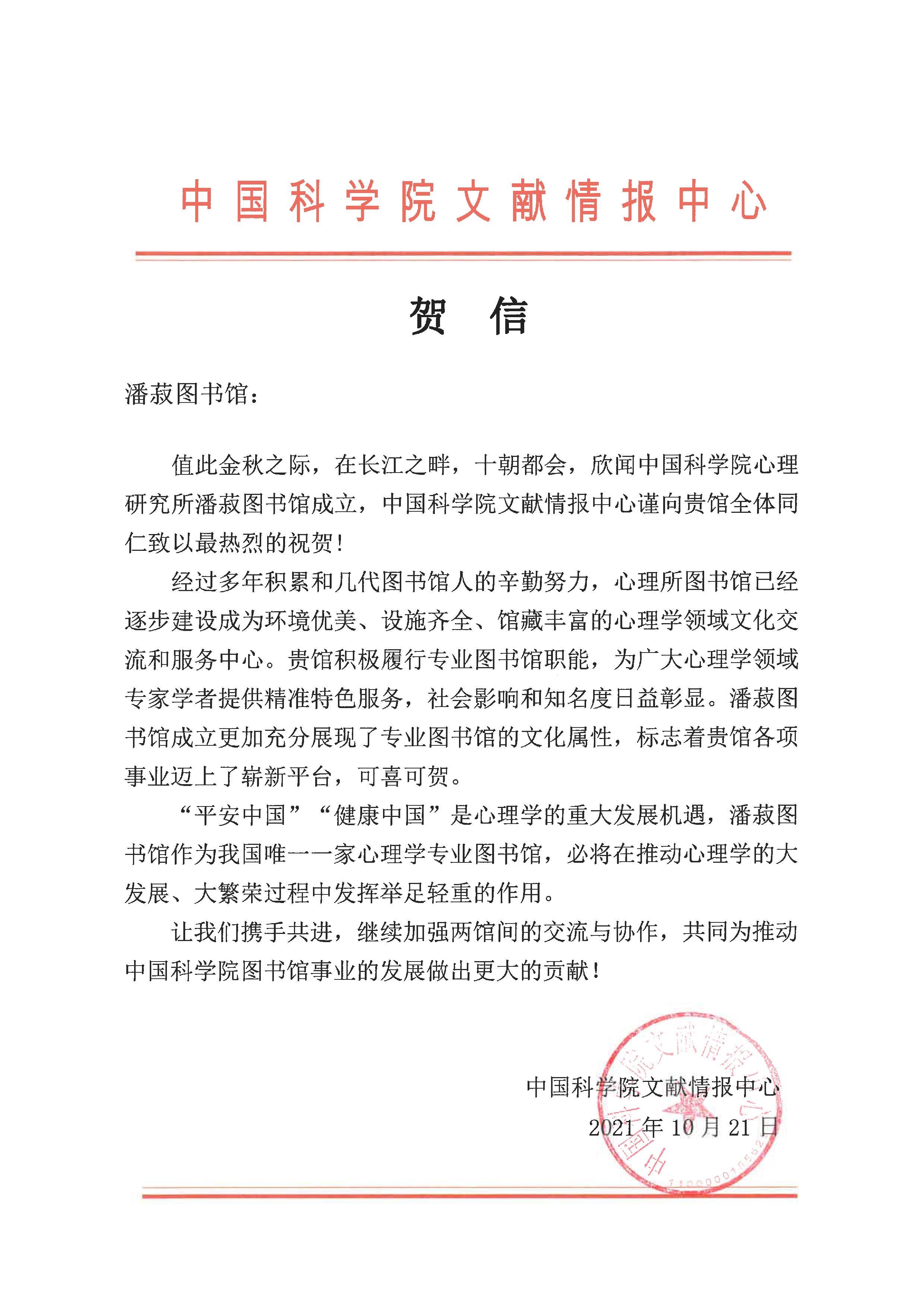 中国科学院文献情报中心也为潘菽图书馆的成立发来贺信。信中充分肯定了心理所潘菽图书馆的建设成绩,作为环境优美、设施齐全、馆藏丰富的心理学领域文化交流与服务中心,希望图书馆抓住“平安中国”“健康中国”的重大发展机遇,在心理学的大发展、大繁荣中发挥举足轻重的作用,共同推动中国科学院图书馆事业的发展。