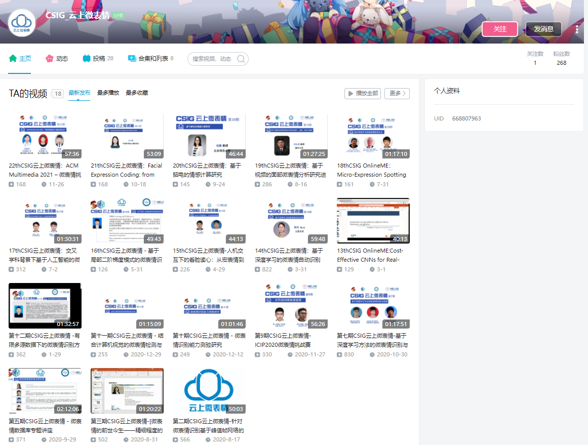 “云上微表情”是由中国图象图形学学会(CSIG)主办、CSIG机器视觉专业委员会和CSIG情感计算与理解专业委员会联合承办,永乐汇王甦菁与李婧婷组织的学术活动。其目的在于促进心理学领域和计算机视觉领域针对微表情的进一步研究。至今为止已成功举办22期,总计参会人数千余人。B站开设的账号“CSIG_云上微表情”,视频播放次数达六千余次。同时,相关活动通过微信公众号“CSIG机器视觉专委会”进行报道,得到了微表情领域研究人员的广泛关注。