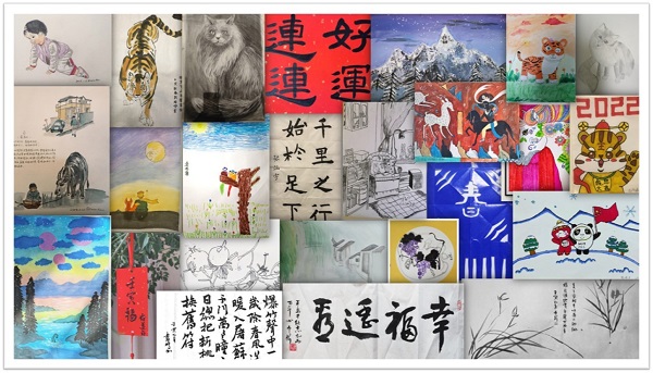 本次参展的作品涉及建党百年、虎年春节、冬奥会等多个主题,包含书法、剪纸、素描、国画等多种形式,展现了作者们积极向上的生活态度和对艺术的热爱与追求。