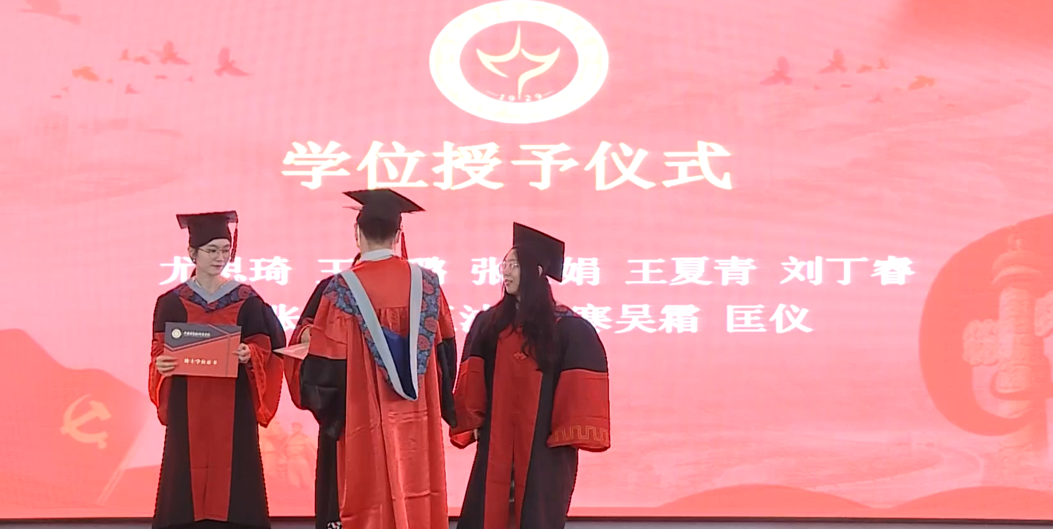 在随后进行的奖项颁发环节,荣获国家奖、所长奖、优秀毕业生荣誉、瑞沃德奖学金的多位同学依次上台领奖。在学位授予仪式上,各位导师为依次上台的毕业生颁发了学位证并进行拨穗。拨开帽穗,象征着毕业生学有所成,即将展翅高飞,蕴含了浓浓的师生之情和对学生的殷殷教诲。