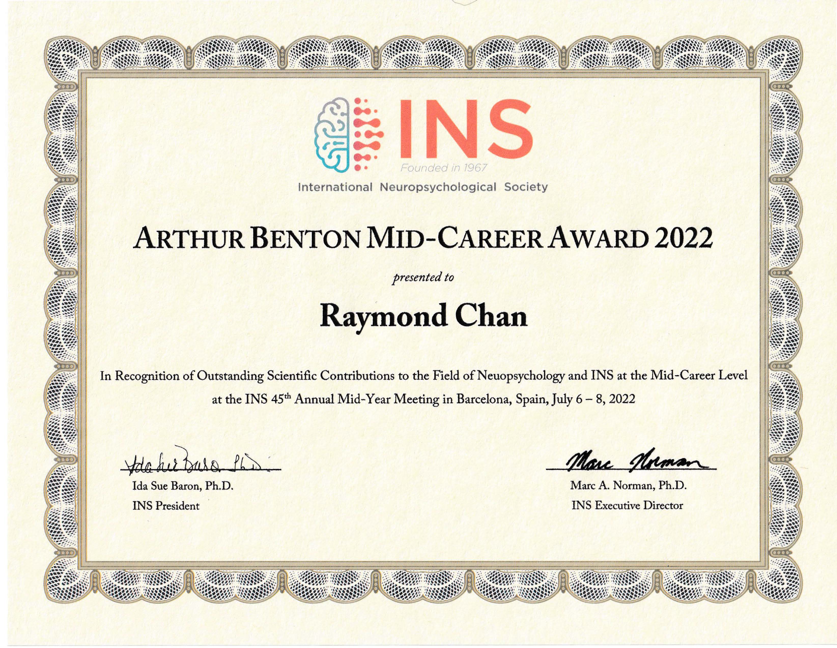 陈楚侨研究员获国际神经心理学会“亚瑟·本顿” 中期职业生涯成就奖