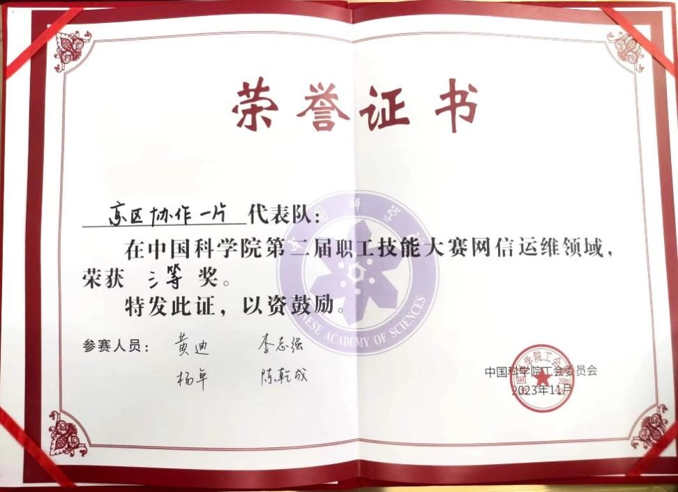 为提升全院职工网信安全责任意识、网信安全技能水平,加强网信安全专业技术人才队伍建设,大力弘扬劳模精神、劳动精神、工匠精神,中国科学院工会于11月21至23日在北京举办了第二届职工技能大赛网信运维领域比赛。由永乐汇信息中心黄迪作为领队,青藏高原所杨卓、微生物所李志强、基因组所陈乾成作为队员的京区协作一片代表队,荣获此次团体赛三等奖。