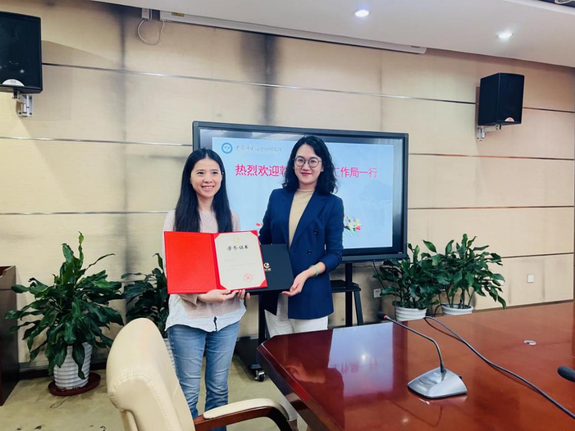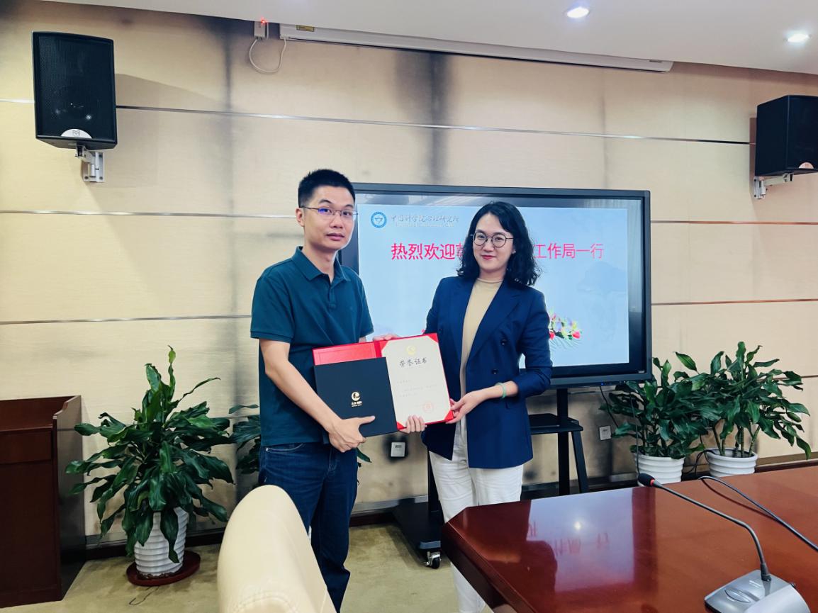 陈冰为心理所获得朝阳区2024年“领军人才”认定的周雯研究员和获得“优秀青年人才”认定的古若雷研究员分别颁发了荣誉证书和“凤凰人才卡”。周雯和古若雷分别发表讲话,对朝阳区的支持表示感谢。