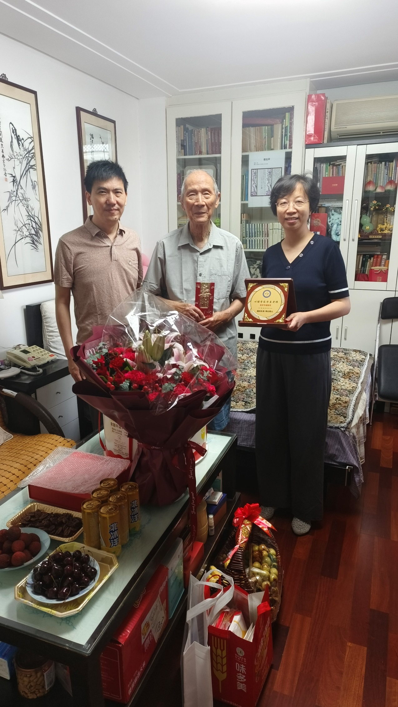 所领导耐心聆听,亲切交谈,仔细询问了方老师的日常生活情况和身体状况,转达了因工作冲突未能到场的党委书记孙向红、纪委书记刘斌的关心问候,并向方老师报告了近些年心理所以及认知科学与心理健康全国重点实验室的发展情况,嘱咐方老师一定要保重身体,保持积极心态,并衷心地祝福方至老师百岁快乐!福如东海、寿比南山!期间,所领导一并探望了95岁高龄常年卧床的方老师爱人。