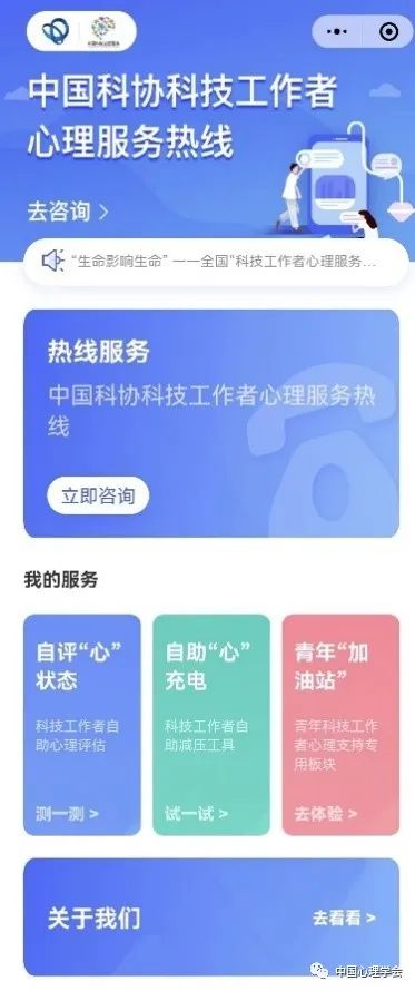 图:“中国科协科技工作者心理服务热线”小程序主页面