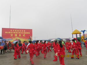激动、欢喜、思绪万千,所有的情绪都汇聚在接下来的文艺表演中。板房各社区的群众代表及大爱无言艺术团共同带来了这场精彩的文艺表演。这时天空虽然下起了雨,但人们对这场活动的热情却丝毫未减,几个人打一把伞站在雨中继续观看演出。开场的腰鼓表演气势十足,给雨中的舞台升了温,《没有共产党就没有新中国》、《吉祥舞蹈》、《再唱山歌给党听》等歌舞表达了板房群众对党的热爱与歌颂,《我们走在大路上》、《越来越好》、《大北川》、《向着太阳》等歌舞表达了板房群众对未来生活的美好期盼……这些节目都充满着浓厚的北川羌族特色,豪放热情,让人温暖而感动。居住在板房的李兴秀阿姨是今天其中一位表演节目的演员,虽然前段时间她才不幸地失去了儿子,但对于这次活动,她仍旧热情地投入,付出了巨大的努力,她说,“尽管很忙碌,很辛苦,但这是历史性的一刻,我十分乐意为这样的时刻尽自己的一份力,留下自己的记忆”。中科院心理所远东北川震后心理援助中心也派代表献上了节目,为活动添彩。上午11:30,持续了一个半小时的交接仪式在一片喜悦的氛围中结束。
