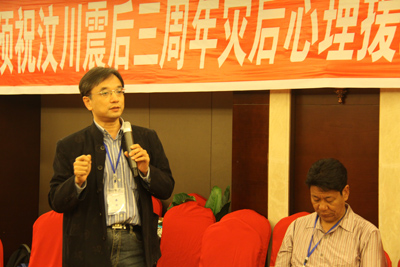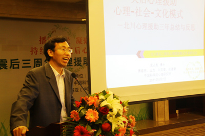 会上,心理所北川心理援助工作站站长史占彪博士以“北川心理援助三年总结与反思”为题作了专题报告,报告中首次提出灾后心理援助的“心理-社会-文化模式”。5.12地震之后,心理所成立专门抗震救灾队伍,开展系统心理援助工作,取得显著成果。三年以来,心理所共投入人力1800多人次,募集社会资金2000多万,在四川建立7个心理援助工作站。据不完全统计,三年来,共有1700余名心理援助志愿者参与到“‘我要爱’灾后心理援助行动”项目中,发放图书宣传册15万份,通过手机移动平台,服务群众200万人,直接服务灾区群众8万余人。北川站作为其中独具特色的心理援助站,持续、系统、专业地坚持在灾区一线开展灾后心理援助工作,针对教育系统、社区系统、机关干部系统、孤残弱势群体,进行系统心理援助和心理能力培训,举办各种特色活动,开展“温暖妈妈”工程、“丝网希望花”项目,开办“心灵茶社”等,并召开多次培训班,帮助众多灾区人民走出心理阴影,推动他们重新寻找生命的意义,在灾后心理、社会、文化的心理援助上做了有益的探索。