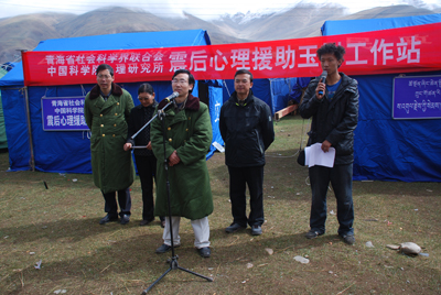 5月20日,青海省社科联和中科院心理所在玉树震后最大的扎西科赛马场灾区安置点联合成立“青海省社科联-中科院心理所震后心理援助玉树工作站”。这标志着心理所成为第一支进入玉树重灾区的有组织的专家团队,玉树震后心理援助工作从此又迈上一个新台阶,进入到政府领导、纳入政府规划的重要阶段。