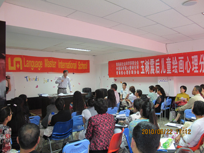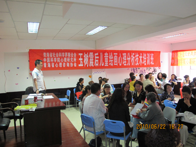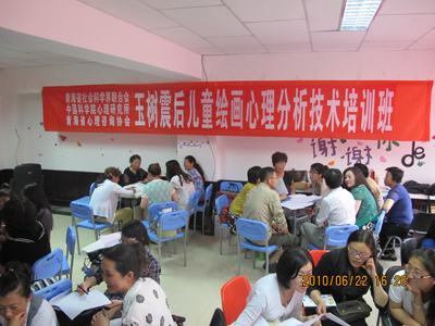 6月22日,由青海省社会科学界联合会、永乐汇主办,青海省心理咨询协会,震后心理援助西宁站承办的首期“玉树震后儿童绘画心理分析技术培训班”在青海西宁结束。这是针对玉树转移来宁5000余名大中小学生开展“创造性艺术治疗技术连续培训”项目的开端。来自西宁市华罗庚学校、行知小学、培民中学等的中小学教师,青海民大、青海师大大学教师以及来自30多个单位的70余名西宁心理咨询从业人员接受了为期三天的培训。活动得到了青海民大、西宁力托国际语言培训机构的大力支持。中南出版传媒集团北京涌思图书有限责任公司特意为此次培训捐助了100本《心理画》作为培训专用教材。